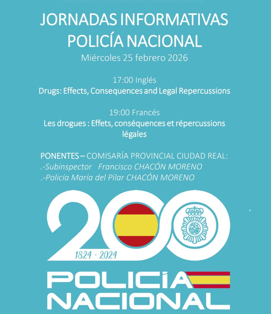 El miérecoles 25 de febrero la Policía Nacional dará 2 charlas informativas en inglés y francés sobre las drogas: efectos, consecuencias y repercusión legal. Inglés: 17 hrs Francés: 19 hrs