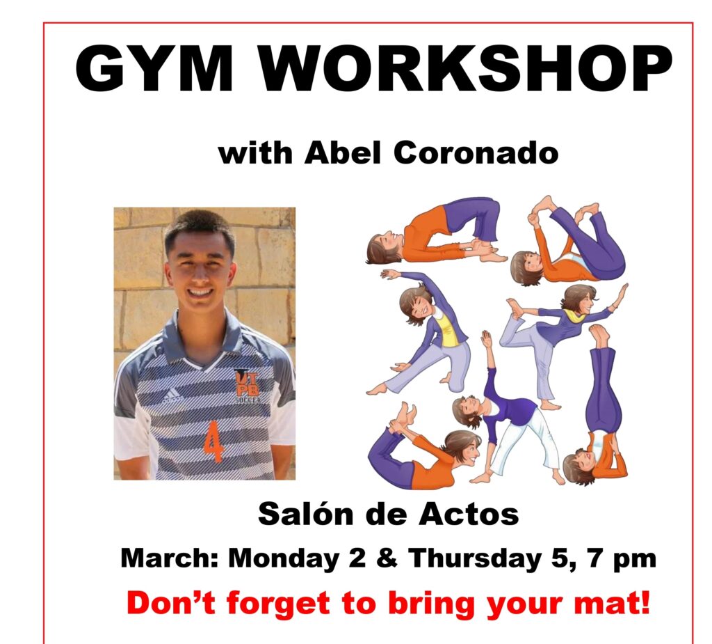 Los días 2 y 5 de marzo, a las 19:00 h, Abel Coronado, lector del Departamento de Inglés, impartirá un taller práctico de entrenamiento en inglés. Salón de Actos. Una oportunidad perfecta para practicar el idioma de forma dinámica y activa. Importante: No olvides tu esterilla