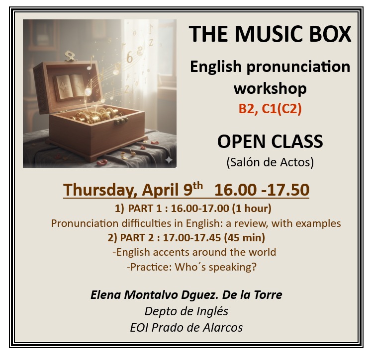 Mejora tu pronunciación en inglés de forma dinámica en esta sesión especial, donde trabajaremos las principales dificultades y exploraremos distintos acentos. 👩🏫 Elena Montalvo 📅 9 de abril⏰ 16:00 – 17:50📍 Salón de Actos Una oportunidad perfecta para entrenar tu oído y ganar confianza al hablar.