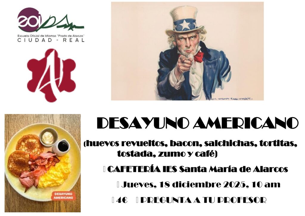El próximo jueves 18 de diciembre tendrá lugar la celebración de un Desayuno Americano en la cafetería del IES Sta Mª de Alarcos.