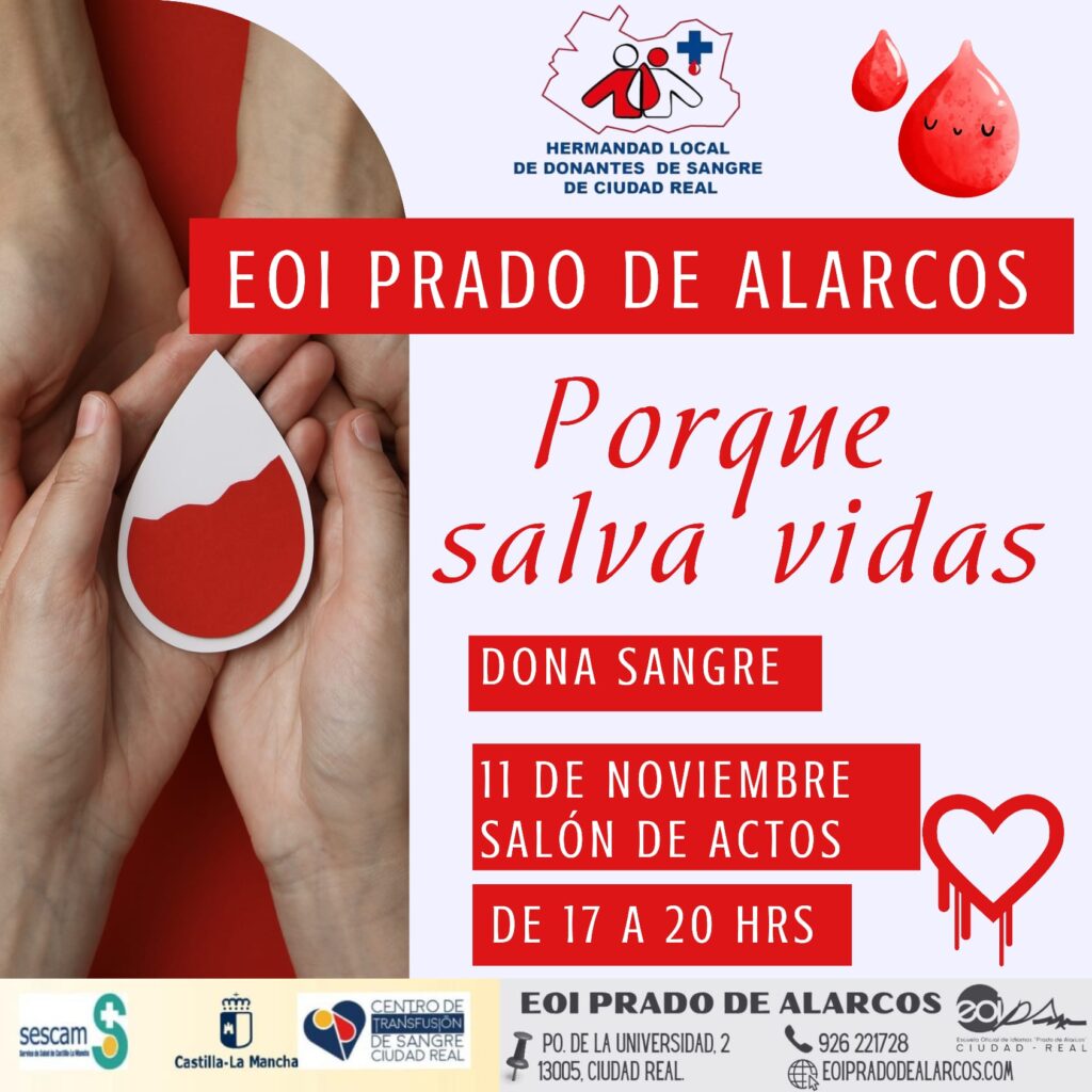 El próximo martes, 11 de noviembre de 17 a 20 horas, celebramos una nueva jornada de donación de sangre en el Salón de Actos de la Escuela.